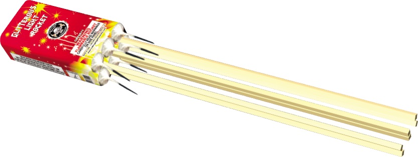 Sky rockets zoom up and break with color an/or noise. Each rocket is securred to a launching stick. Sky rockets come in many sized and effects!
